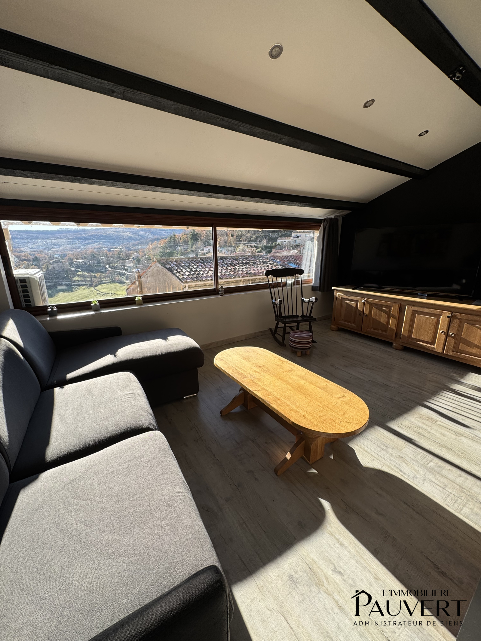 Un salon lumineux de 26,52 m²,la cuisine ouverte et la buanderie s’y retrouvent dans un esprit offrant une vue dégagée et imprenable sur les montagnes environnantes ;