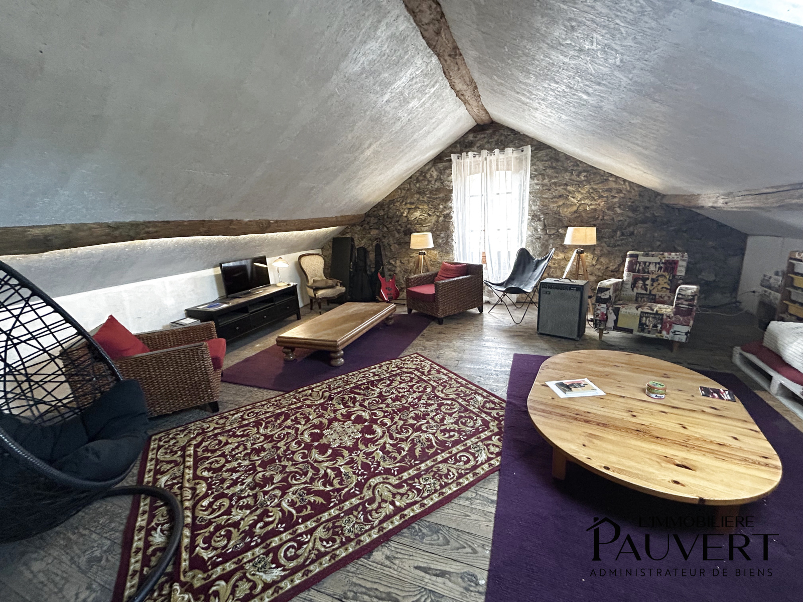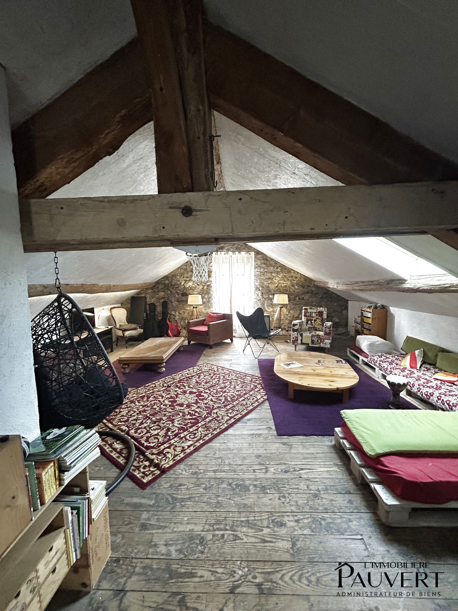 °Superbe séjour sous les toits de 70m2 entièrement en pierre et bois, offrant un cachet exceptionnel.